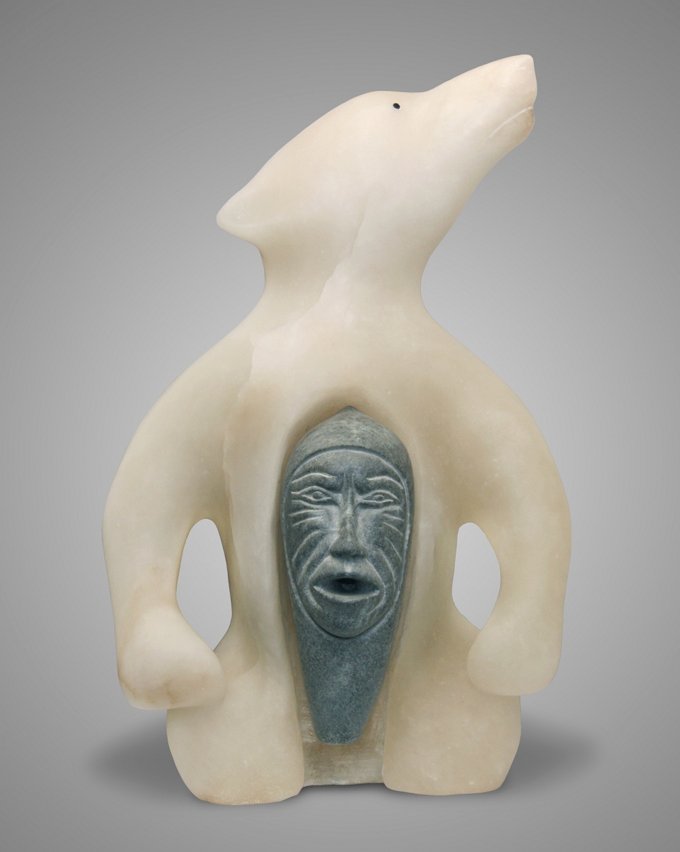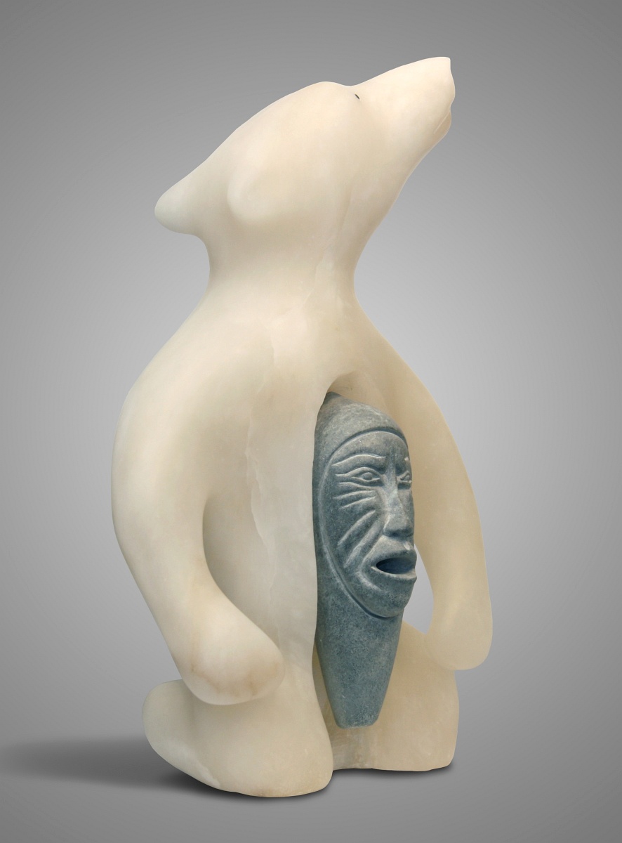 This sculpture of white alabaster and soapstone depicts a shaman who has taken on the form of a bear (nonuk). He has become his spirit familiar (spirit helper) through trance induced dance or spirit communion. The polar bear represents the power of the shaman and also the bear as the most powerful of the animal spirits.