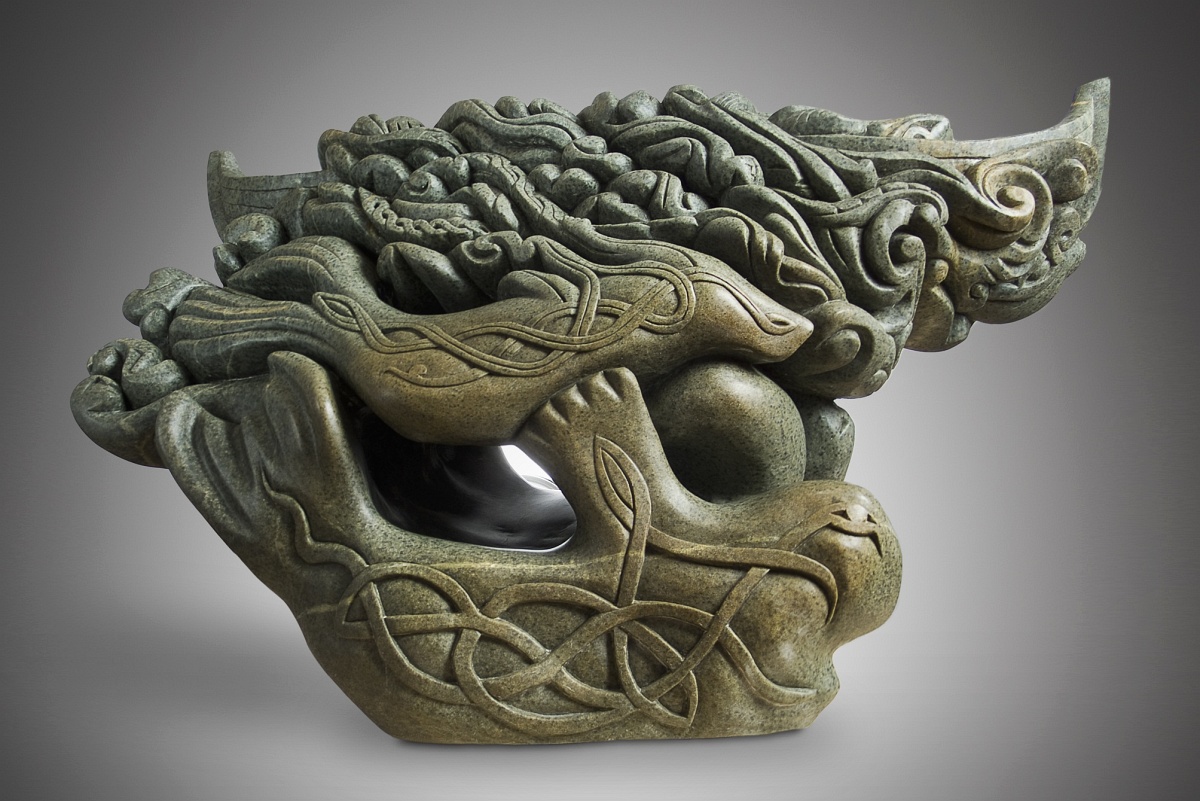 This sculpture tells the story of the Viking Norse on their heroic quest to find new land. This journey took them from their homelands in Scandinavia to the shores of England, Scotland, Ireland and the northern islands. Their journey continued on to Iceland, Greenland and mainland North America. The sea mammals and polar bear represent the animals they hunted for food, fur, leather and ivory. The churning and intertwining waves with decorative motifs spilling onto the gunwhales and deck of the boat represent their material culture and spiritual beliefs.